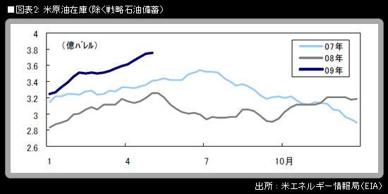 しかし、こうした足元で見られている原油価格の騰勢については、世界景気の回復による原油需要の持続的な増加、あるいは産油国による供給削減強化のいずれかもしくは双方による需給バランスのタイト化といった裏付けのない、言い換えるとファンダメンタルズに沿っていない動きだと判断される。例えば、筆者が米景気回復の度合いをチェックする上で有用と考えている米国内原油在庫の数字は、淡々と積み上がり続けている。中国の原油需要増加をはやす動きもあるようだが、世界経済全体から見ればささやかな動きにすぎないだろう。