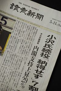小沢辞任会見当日の5月11日付読売新聞朝刊は、1面トップ大見出しで「小沢氏続投『納得せず』7割」と報じた。同紙によると、公設秘書起訴後の小沢続投に「納得できない」という世論調査の回答は71%(前回4月調査66%)に達し、「納得できる」は22%にすぎない。民主支持層に限っても、「納得できない」は56%(同43%)に上る。一方、内閣支持率は28.7%(同24.3%)にまで回復し、不支持率は59.7%(同66.5%)に低下した。