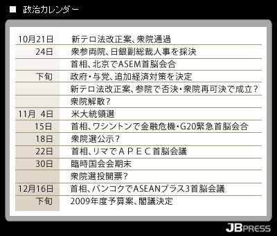 次期衆院選の時期について、森は「年内なら11月23、30日がぎりぎりだ。それを過ぎれば2009年度予算編成後の来年にずれ込む」との見通しを示した。12月の予算編成時期の解散・総選挙は回避されるだろうとの見方は与野党に共通する。