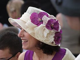 紙袋から取り出したしゃれた帽子をちょこんと頭に載せて、連れのお友達に披露しているマダムがいる。そう。この「ディアンヌ賞」は、エレガントな帽子の女性たちが集うことで知られるレース。競馬場がもっとも華やかに彩られる日なのである。