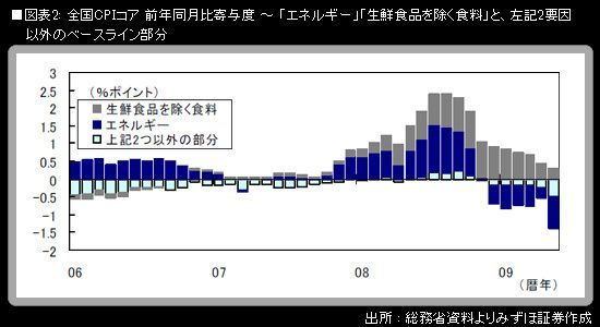 5月の全国CPIコアを品目別に見ると、「被服及び履物」がコア前年同月比を押し上げる方向に寄与する一方、「ガソリン」「電気代」「生鮮食品を除く食料」「都市ガス代」「自動車」など数多い品目が押し下げる方向に寄与した。「ガソリン」については、2008年4月に暫定税率期限切れで一時的に値下がりしていた要因が前年同月比を算出する上で5月は剥落したため、押し下げ方向に大きく寄与することになった。