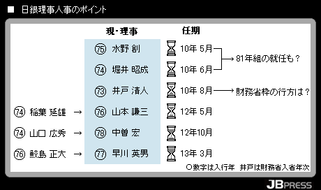 現在の顔ぶれは就任順に水野創(75年)、堀井昭成(74年)、井戸清人(73年=財務省枠)、山本謙三(76年)、中曽宏(78年)と前出の早川。このうち、水野、堀井、井戸の3人は2006年の就任で、来年5月以降に順次任期を迎えるため、来年は3人もの新任理事が誕生する。