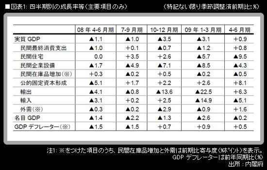 内閣府から17日に発表された4-6月期の四半期別GDP速報(QE)で、実質GDPは前期比+0.9%(同年率+3.7%)となった。前期比プラス成長は5四半期ぶりのことであり、景気底打ち観測を裏付ける動きになった。前期比への内外需別寄与度は、内需が▲0.7%ポイント、外需が+1.6%ポイント。