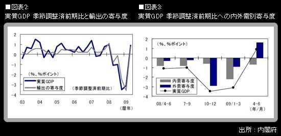 しかし、実質GDPは前年同期比で見た場合は▲6.4%という非常に弱い数字であることに留意したい。米国で大きなバブルが崩壊し、借金とキャピタルゲインに依存していた同国家計の過剰消費が急速な削ぎ落としを余儀なくされたことで、世界経済の需要レベルは大きく下方にシフトした。そこを起点にして輸出が増減することを基盤として、景気循環の上下動が繰り返されていくという、「L字の横棒が小さな波を繰り返す形」の状況を、筆者は日本経済の今後のシナリオとして想定している。今回のQEにおける実質プラス成長への転換は、「小さな波」のうち最初の上向きの動きが、経済データの形で確認されたものだと言えるだろう。