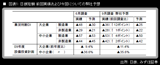 前回6月調査では、輸出・生産の急減ショックから立ち直り始めた大企業については業況判断DIの改善が確認されたものの、中小企業・非製造業では悪化するなど、景況感のばらつきが目立った。今回も同様のばらつきが見られるだろう。また、生産設備や雇用人員の根強い過剰感と、2009年度設備投資計画の断層的な落ち込み状況にも、変わりはあるまい。総じて、前回6月調査の延長線上の内容が予想される。