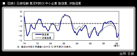 中小企業の業況判断DIは、製造業が▲52(前回調査比+5ポイント)・12月予測▲44、非製造業が▲39(前回調査比+5ポイント)・12月予測▲40。前回6月調査で悪化を続けていた中小企業・非製造業も改善に転じたが、予測は1ポイント下がっており、国内需要の「地盤沈下」が続く中で、回復力の弱さが際立っている。