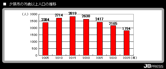 夕張では、65歳以上人口はすでに減少に転じているのです。75歳以上人口の推移を見ても、2015年をピークに減少に転じます。高齢化率だけ見ていると、このことは見落とされます。
