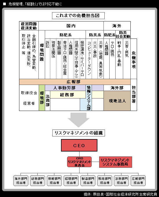 従来、危機に直面した企業は「縦割り」で対処する傾向にあった。しかしそれでは満足な対応はできず、メディア対応などを誤って危機を深める結果を招いてきた。このため、「組織横断」でリスクを管理する体制の構築が不可欠になっている。