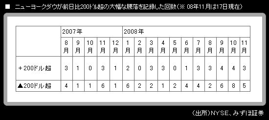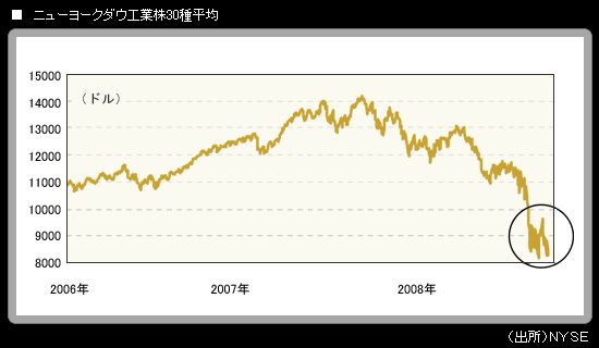 週明け 17日の米株式市場で、ニューヨークダウ工業株30種平均は前日比▲223.73ドル の大幅安。終値は 8273.58ドルとなった。終値ベースの直近ボトムは、10月27日に記録した 8175.77ドル。そこまであと100ドル弱ということになった。筆者は、その水準を割り込んで株安が進むものと予想している。