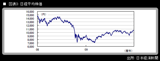 2009年の株式相場は、世界同時不況と信用不安を背景に、売りが先行する展開。3月には日経平均株価が7000円割れ寸前となり、TOPIXは700を割り込んだ。しかし、危機対応の政策総動員を好感して米国株が上昇に転じると、日本株もその流れに乗って水準を切り上げる展開に。中国経済の高成長への期待感も、株価上昇の原動力になった。6月中旬、日経平均は1万円の大台を一時回復。衆院選で民主党が大勝した直後の8月31日に、ザラ場で1万767.00円を記録した。その後、為替の急激な円高ドル安や、鳩山新内閣の政策運営への失望感、銀行などの増資による需給悪化懸念などから、日経平均は再度1万円割れとなったが、11月下旬に9000円割れ寸前まで下げた後は、反転上昇基調に。12月には、米国株の年初来高値更新やドル/円相場の92円台回復を追い風に、日経平均は堅調に推移。大納会のザラ場で一時1万700円台を回復し、終値ベースの年初来高値(8月26日の1万639.71円)を上回る場面があったものの、終値は1万500円台にとどまった。