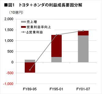 図1は、トヨタ自動車とホンダの合計を例に取って、過去20年間の利益の増減要因を分解したものである。