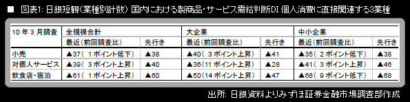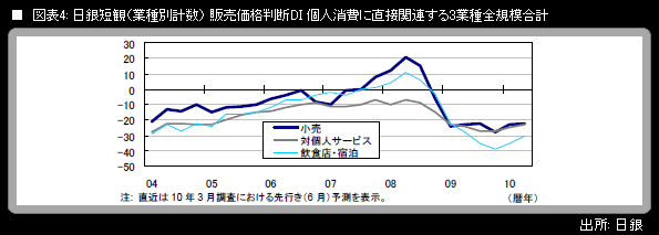 また、上記3業種の販売価格判断DI(「上昇」-「下落」)は、全規模合計では、3業種ともに前回調査比で上昇した。しかし、DIがすべてマイナス圏に沈んだままであることや、中小企業「飲食店・宿泊」でDIが低下したことなど、デフレの根深さが感じられる結果でもある。