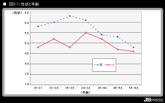 年齢と性欲との関係を調べた学者がいます。テキサス大学のデビッド・シュミット教授らですが、2002年のカナダの雑誌にその研究が発表されています。年齢が様々な1000人近い人たちにアンケートしたところ、図表5-1のような結果となりました*1。