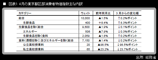 4月30日に総務省が発表した4月の東京都区部消費者物価指数(都区部CPI)は、「生鮮食品を除く総合」(コア)が前年同月比▲1.9%となり、マイナス幅は前月から0.1%ポイント拡大した。政府が4月から実施している高校授業料の実質無償化措置がCPI品目「公立高校授業料」「私立高校授業料」に反映されたことが主因であり、総務省はそれぞれの押し下げ寄与度が▲0.21%ポイント、▲0.17%ポイント、合計▲0.37%ポイントであることを、公表資料の中で確認した。これらのうち「私立高校授業料」については、筆者が事前に予想していたほどは、マイナス寄与度は絶対値が大きくならなかった。コア前年同月比の押し下げには上記のほか、「家賃」「都市ガス代」「航空運賃」などが寄与した。一方、押し上げに寄与した品目は、「外国パック旅行」「被服及び履物」「生鮮食品を除く食料」「電気代」などである。高校授業料無償化要因以外の各種要因の差し引きで、コア前年同月比はプラス方向に押し戻されたため、前月からのコア前年同月比マイナス幅拡大が0.1%ポイントにとどまったということである。