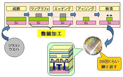 しかし、リソグラフィ技術だけでは、微細加工は完結しない。右の図に示したように、まず成膜があり、次にリソグラフィ、その後ドライエッチング、アッシング、洗浄、検査がなされて、初めて微細加工が完結する。すなわち、リソグラフィは前工程の一要素技術に過ぎない。