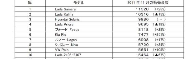 2011年11月の新車販売速報を見ると、売り上げ1位から10位までに入っているのは、すべてロシアで現地生産されているモデルばかり。それも「Lada」のように20万ルーブルから40万ルーブル(50万円から100万円)で手に入るモデルが上位を占めている。