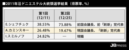 ソ連崩壊から20年間にわたり沿ドニエステル共和国の独立路線を指導してきたイゴール・スミルノフは、ロシアからの援護を受けられず強力なライバルたちの前に選挙で惨敗、あっけない幕切れを迎えた。
