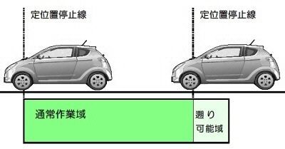 下の図は、長い組立コンベアの1ピッチ分を表したものです。通常コンベア上の凹みに車両の前輪を入れて位置決めしているので、車両の位置は前輪で表します。