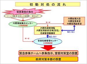 原子力災害の場合、原子力事業者からの原子力緊急事態(15条事態)の通報を受けた場合には、首相は、直ちに考慮の余地なく「原子力緊急事態宣言」を発し、自身を本部長とする「原子力災害対策本部」を設置することとされている。本対策本部の事務局は経産省緊急時対応センター(ERC)に置かれることになっており、保安院長が事務局長として事務的な司令塔の役割を果たす。この場合においても、安危担当の内閣官房副長官補が所掌することとされている。