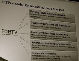 FOB TV(Future of Broadcast Television)は、現在3つに分かれている地デジ放送規格を次世代で統一する動きである。昨年の11月に、第1回 FOB TV 会議が上海で開催された。