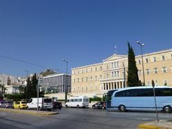 プラカ地区の西沿いとゼウス神殿や国立公園のある緑の敷地エリアに挟まれ、市内を南北に走るアマリアス大通りを北上すると、右手に遠くリカヴィトスの丘を臨みながら、ドーリア式大理石の柱がいかにもギリシャ風の印象を与える国会議事堂の立派な建物が見えてくる。