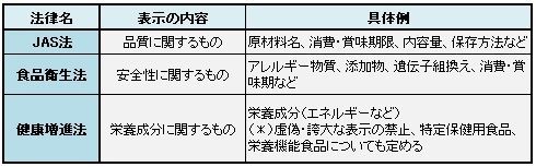JAS法は「賞味期限」「原材料名」など品質に関する表示を定め、食品衛生法は「アレルギー」「添加物」など安全性に関する表示を定めている。健康増進法は、特定保健用食品や栄養機能食品などを含む「栄養表示」を定めている。