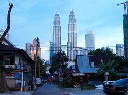 ツインタワーを背景に穏やかなカンポンの暮らしが営まれるカンポンバル