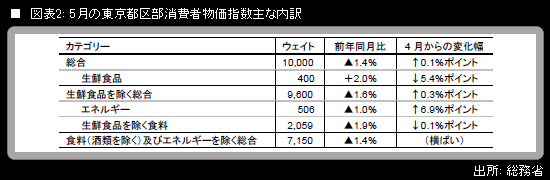 5月の東京都区部消費者物価指数(全国CPI)は、「生鮮食品を除く総合」(コア)が前年同月比▲1.6%。マイナス幅は前月から0.3%ポイント縮小した。その主因はエネルギー関連。コア前年同月比の押し上げに寄与した品目は「電気代」「都市ガス代」「ガソリン」「家賃」など。押し下げに寄与した品目は「生鮮食品を除く食料」「被服及び履物」などである。