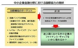 近年における中小企業政策に関する世界的な議論は、政府の役割は公平なビジネスの場を提供することとされ、中小企業金融分野の国際協力もこうした影響を強く受けている。つまり、金融監督・規制や金融インフラ整備支援を基本としつつ、大手商業銀行を中心とした組織改革、あるいは、社会政策・貧困対策としてのマイクロファイナンス支援が中心的な活動内容となっている。