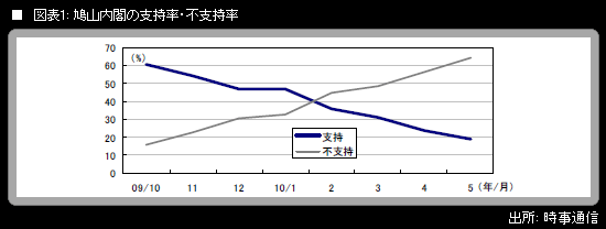 昨年9月の発足直後には各種世論調査で60~70%台という高水準になっていた鳩山内閣の支持率は、今年5月には20%前後にまで落ち込んでいる。米軍普天間基地移設問題が原因となって社民党が連立政権を離脱した後、参院民主党の改選組を中心に、鳩山由紀夫首相の退陣を事実上求める動きが表面化。首相の進退問題が一気にクローズアップされる事態になった。