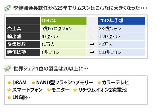 1987年からの25年間でグループ売上高は39倍、時価総額は303倍になった。輸出立国である韓国全体の輸出額に占めるサムスングループの輸出額の比率も30%近くに達した。サムスングループが韓国経済の牽引役だったことも間違いがない。