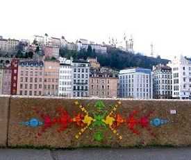 雨上がりの空にフワッとかかる虹のように、街角の壁に、輝く虹色の絵が現れた。スプレーの絵ではない。なんだか立体感がある。色紙? そう、何枚もの折った折り紙を張り合わせたOrigamiストリートアートだ。