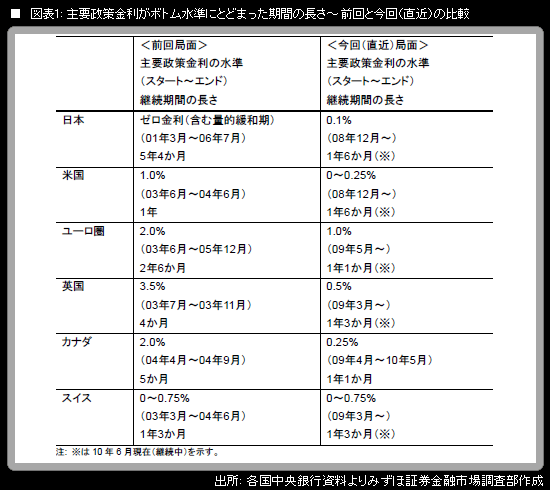 G7の中央銀行、およびG7外ではあるが欧州の国の中で比較的注目度が高いスイスについて、主要政策金利がボトム水準でどの程度「滞留」したのかを、前回局面と今回(直近)局面について比較してみたのが、下表である。