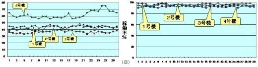 機差が小さいか大きいか、これが半導体生産にどのように影響するのか? まず、機差が大きい装置の場合、工程ごとに専用装置化する。例えば、1号機は素子分離工程専用、2号機はゲート工程専用というように。装置が空いていると言っても、指定された工程以外のウエハを処理することはできない。ある工程専用に調整されているからだ。その結果、装置の稼働率は、せいぜい50%程度になってしまう(図2左)。