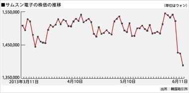 2013年6月11日、韓国の証券市場でサムスン電子の株価は前日比3万6000ウォン(1円=11ウォン)下落して138万9000ウォンになった。下げ幅は2.5%。サムスン電子の株価が140万ウォンを下回ったのは1月28日以来のことだ。