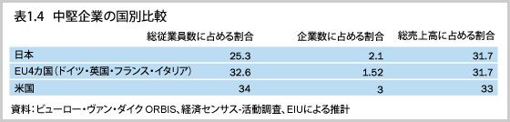 主要先進国と比較すると、中堅企業の従業員が労働人口に占める割合は若干低い(大企業が持つ圧倒的な雇用能力が影響を及ぼしていることは想像に難くない)。だが興味深いのは、生産性つまり従業員1人あたりの売上高が、他の先進国より優れている点だ(表1.4参照)。
