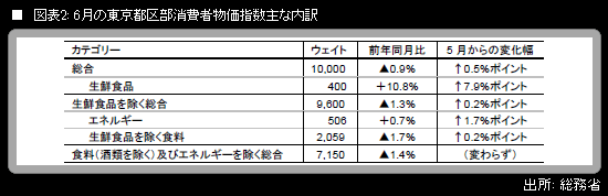 6月の東京都区部消費者物価指数(全国CPI)は、「生鮮食品を除く総合」(コア)が前年同月比▲1.3%で、マイナス幅は前月改定値から0.2%ポイント縮小した。コア前年同月比の押し上げには、「電気代」「都市ガス代」「生鮮食品を除く食料」などが寄与。一方、押し下げには、「家賃」「ガソリン」「外国パック旅行」などが寄与した。