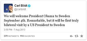 スウェーデンのカール・ビルト外相は、オバマ訪問が発表された同日、ツイッターに「我々は9月4日のオバマ大統領のスウェーデン訪問を歓迎する。素晴らしい。これは最初の米国大統領の真の2国間訪問になる」と書き込んでいる。