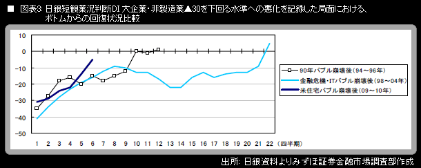 大企業・製造業の業況判断DI(「良い」-「悪い」)は+1(前回調査比+15ポイント)。弊社が予想していた▲1を上回った。同DIがプラスの数字になったのは、2008年6月調査以来2年ぶりのことである。中小企業・製造業の業況判断DIも、連動して大幅に改善した。