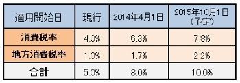 消費税の使途は年金や医療・介護の社会保障や、少子化対策に限定される。税率は下表の通り2014年4月から8%に、2015年10月から10%と2段階で引き上けられる見通しだ。10%への引き上げについては「その時の経済状況を踏まえて決定する」という。