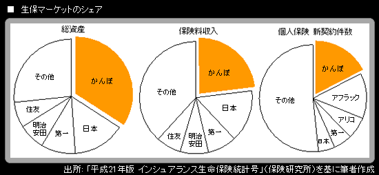 2009年3月末のかんぽ生命の総資産は106兆円に達し、これは民間保険会社トップである日本生命保険(45兆円)の2倍以上。かんぽ生命を含めた生保業界の合計資産の1/3に相当する。また、生命保険加入者が年間に納める保険料合計34兆円のうち、約1/4をかんぽ生命が占めている。
