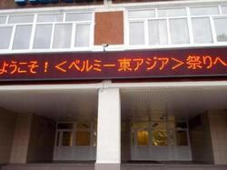 今回のフェスティバルで主役を演じたペルミ市立ギムナジア2番校。我々が到着すると、玄関の電光掲示板には日本語で歓迎の文字が