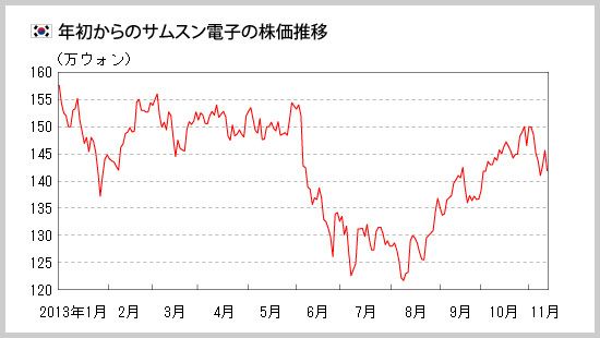 2013年11月14日現在の株価は144万ウォン(1円=11ウォン)前後だ。年初の株価は157万ウォンで、サムスン電子の株価は年初水準から10万ウォン以上低い水準なのだ。