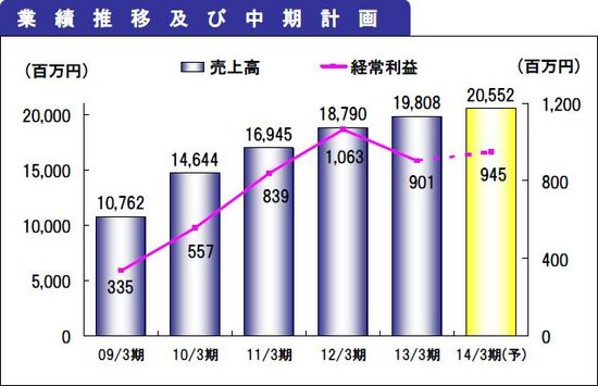 2013年3月期決算は、売上高で前期比5.4%増の19,808百万円、営業利益で同13.6%減の902百万円と増収減益となった。事業別に見ると、外食事業が順調に店舗数を拡大して増収増益となった一方、食料品販売事業は、競合他社の商品リニューアルや広告攻勢の影響を受けて増収ながら減益となった。