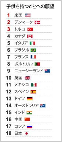 2010年に英カーディフ大学の研究グループが、世界18カ国で行った調査では、子供を持ちたいと考える人が日本では最低である。
