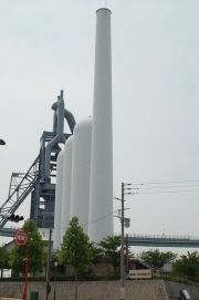 ジェットコースターが走る音を聞きながら、スペースワールドとは反対方向に向かう。数分歩くと、これまた背の高い白い塔が線路わきにそびえ立っている。東田第一高炉史跡の煙突と熱風炉である。