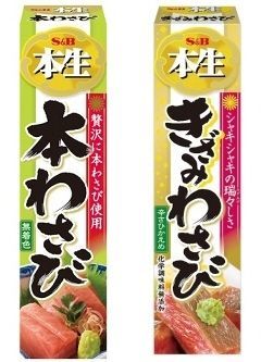 左が、原材料のわさびを本わさび100%とした「本生 本わさび」。サメ皮ですりおろしたようなきめ細かいなめらかさ、清涼感のある風味、辛みが特徴。右は現在発売中の「本生きざみわさび」。控えめな辛さと茎わさびのシャキシャキとした食感が味わえる。