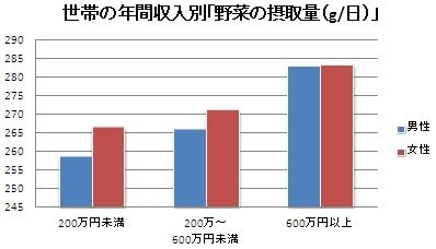 これを見ると、世帯収入が主に3つに分かれているが、年収200万円未満の世帯と、600万円以上の世帯では、摂取量に差がついていることが分かる。