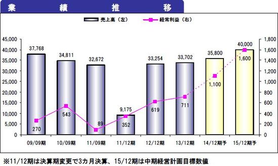 中期経営計画2年目の2014年12月期は、売上高が前期比6.2%増の35,800百万円、経常利益が同54.5%増の1,100百万円を見込む。期末店舗数は14店舗増の258店舗を計画し、既存店の堅調な売上高推移と新規出店効果で利益目標を達成する方針である。