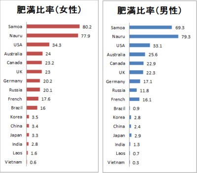 ここでは、BMI([体重]÷[身長の2乗])が30以上の人を肥満と定義し、肥満人口が人口全体に占める肥満比率を計っている。